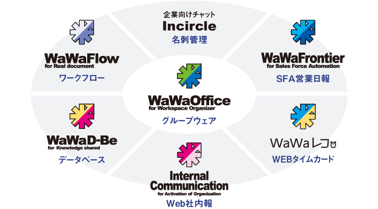 WaWaOfficeは企業内LANを活用して情報共有やコミュニケーションの効率化をはかるグループウェアです。更に導入コストを大幅削減できるASPでご提供しています。 グループウェア【WaWaOffice】を中心に、オプションの ワークフロー【WaWaFlow】、簡易データベース【WaWaD-Be】、営業日報管理【WaWaFrontier】が連携します。 また、データはcsvファイルに出力できるため、既存のシステムとの連携にも役立ちます。