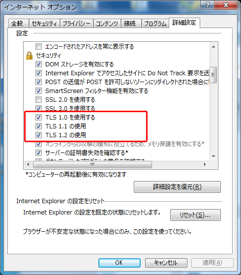 「インターネットオプション」⇒「詳細設定」から下記項目どれかにチェックが入っていることをご確認ください。
