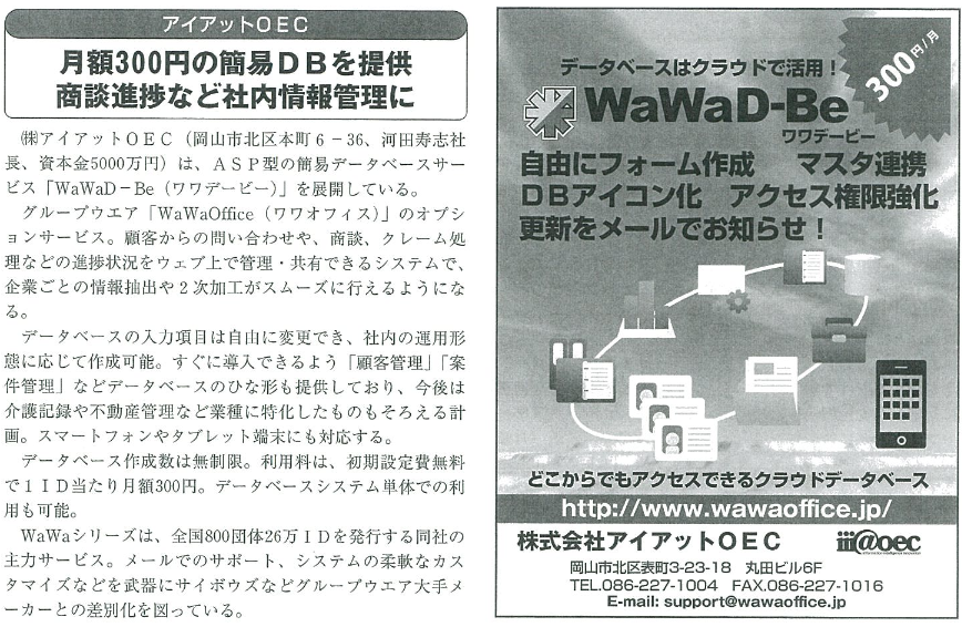 Vision岡山にWaWaOfficeシリーズのデータベース機能の紹介が掲載されました。