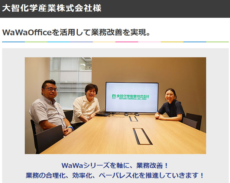 【導入事例】大智化学産業様の事例を公開しました 2017年9月29日 大智化学産業株式会社の導入事例 事例の詳細はこちらをご確認ください。 大智化学産業様事例詳細 最近の新着情報 更新日 2021年7月1日【共催ウェビナー:受付中】7/14開催:商談数を増やす、攻めの営業スタイルセミナー 更新日 2021年1月19日受付終了:【無償提供】WaWaOfficeテレワーク支援プラン 更新日 2020年12月2日【共催ウェビナー】12/10開催:オンラインを活用して「集客・商談」を最適化する!