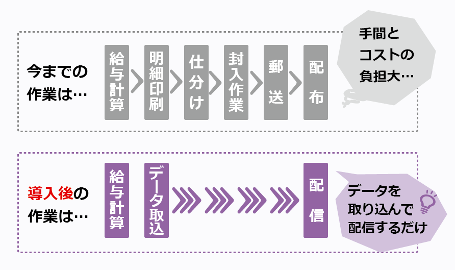 WEB給与明細なら、ペーパレスによるコスト削減はもちろん、今まで行っていた印刷作業、封入作業、郵送代など手間とコストを大幅削減が可能です。