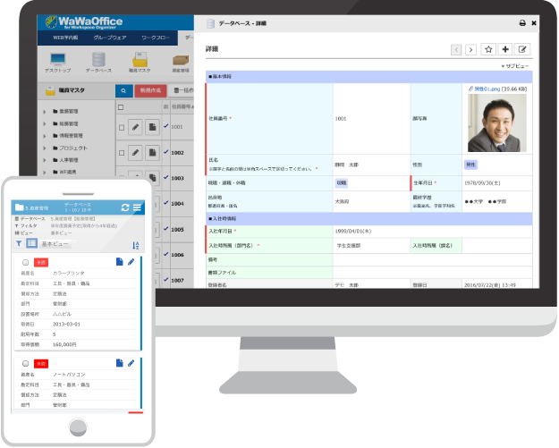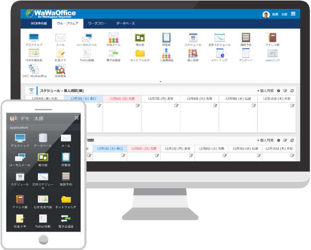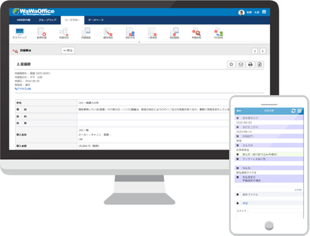 データベース、シングルサインオンなど、各種機能および各種連携が可能なポータル基盤。強力なワークフローになります。
